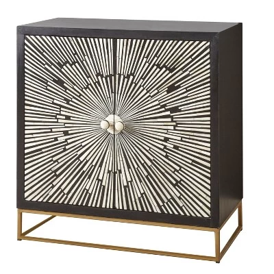 Modern elegance with an Art Deco design, Amika offers timeless style in a functional Accent Cabinet. The front doors feature a sunburst design of black and white bone and resin making it the focal point of your room. A contemporary brass base and neutral hardware give the piece the feel of old Hollywood glamour. Two adjustable shelves provide storage for sweaters, clothing or even electronics to provide the ultimate in functionality and style. Your purchase includes one accent cabinet.