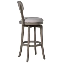 Whether you’re trying to get out of the house in the morning after breakfast, or cleaning up after entertaining friends and family, you want tidying up before you hit the road or hit the hay to be quick and easy. With this Memory Return Counter Stool, getting your seating back in a neat row is a hands-free task. The 180-degree return swivel function of this bar stool keeps your dining area orderly, plus the rustic wood finish, cream upholstery, and shiny silver nail head trim detail along its wingback-style chair make this traditional piece a true stunner that easily fits in anywhere. Assembly required.
