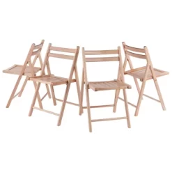 The Robin 4-pc set of solid wood folding chairs in natural finish has a traditional style with the contoured back and slatted seat for comfortable seating. This set of 4 folding chairs are easy to set up, comfortable to sit in and they fold away for storage when you don’t need the extra seating. The chairs are easy to store when they are folded up measuring 17.6″W x 2.8″D x 35.1″H. The seat width is 15.1″ with a height of 17.4″ from the floor and the seat back measures 17.”W x 14.9″H. Mase of solid wood in a natural finish. No assembly required.