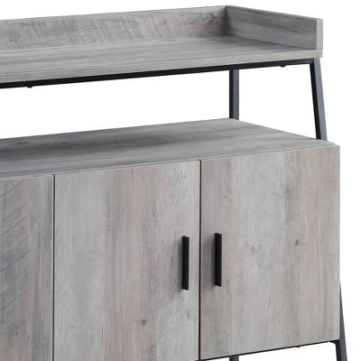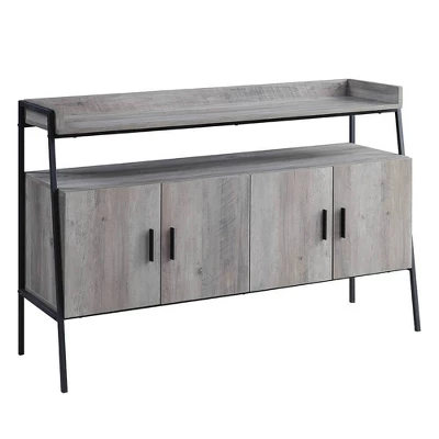 Black metal constructed durable structure features a minimalistic, clutter-free aesthetic with a trapezoidal silhouette. The gray oak finish on the wooden storage section creates warmth and provides a neutral base to pair with your living room decor. This is 4 doors with 4 shelves. The TV Stand has two wooden cabinets for your personal items while a rectangular tabletop with an open bottom shelf is large enough to hold your TV, Blu-ray player, and any other media accessories.