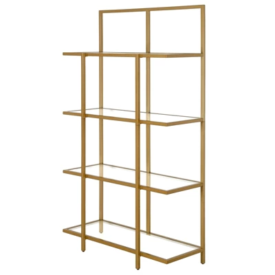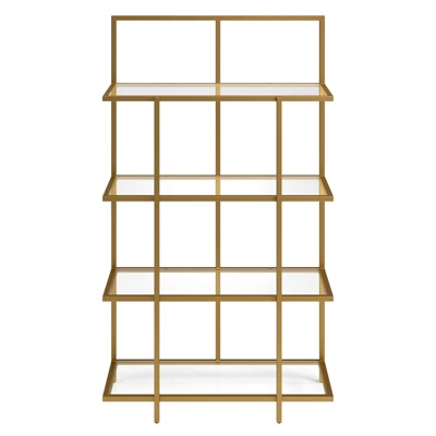 Showcase your favorite books and decorative items with this industrial-inspired 4-tiered bookcase. Clean architectural lines evoke a modern look, creating visual interest in the interplay of its 5-legged frame. Crafted of steel and sturdy tempered glass, its finished in a classic neutral metallic tone, allowing it to pair effortlessly with your existing den or home office décor. At 62” tall, there’s plenty of space to keep your library in order without overwhelming a smaller space.Features : Handcrafted finish is applied to the steel frameMade of sturdy steel and tempered glassEach of its 4 shelves can support 20 lbs.Tip-restraint device includedClean with a soft, dry cloth; no harsh chemicals or abrasive cleaning materials.Specifications : Product Dimensions : 36″W x 14″D x 62″HProduct Weight : 54.67 lbs
