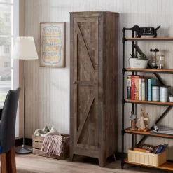 Take farmhouse style decor to the ultimate level with this rustic cabinet. The vertical stand is a prominent furnishing. A barn-style door with a square knob seems to suggest a minimalist lifestyle. However, the oak finished shelf has a bold country stance, that you can’t ignore. Use the piece as a pantry in the kitchen or a bookshelf in the living room.