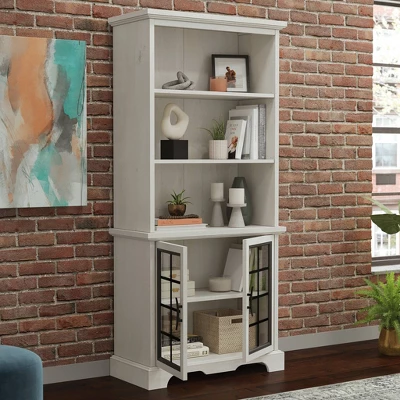 Add stylish storage where you need it with the classic look and versatile design of this bookcase with doors from the Carolina Grove collection. This display bookcase features a strong and lightweight 1″ panel top construction. Three open shelves conveniently store items like work binders, novels, books, and organizing bins. The upper two shelves on this storage bookcase are adjustable, making it a versatile contemporary bookcase to also showcase home décor items like your collection of knick-knacks, decorative plants, and framed photos of loved ones. Behind the double doors with safety-tempered glass is an area that includes another adjustable shelf that creates flexible storage for items of varying sizes. Finished in Winter Oak finish with black accents and door hardware, this stunning 5-shelf bookcase will give your home a distinct style you crave along with the functionality that you need.