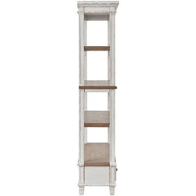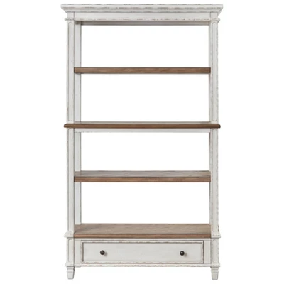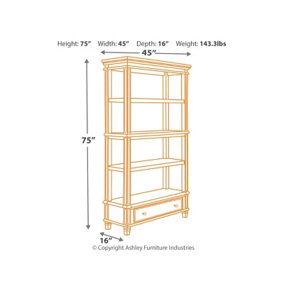 Elevating the art of traditional cottage styling, this bookcase is your heavenly home office realized. Antiqued two-tone aesthetic blends a chipped white with a distressed wood tone top for added charm. Clever balance of shelf and drawer space beautifully works. Signature Design by Ashley is a registered trademark of Ashley Furniture Industries, Inc.