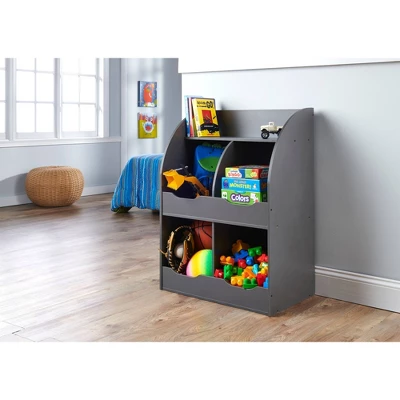 Badger Basket’s Four Bin Storage Cubby’s functional and stylish design allows you to organize and display your child’s favorite toys. The open cubby design is great for storing puzzles, books, dolls, and art supplies, all while keeping everything within your child’s reach. In addition to the bins, the storage unit also includes a half shelf, perfect for small books and other gadgets you want to display. Pair two or three units side-by-side to maximize storage for large playrooms or basements. Overall measurements 24.5L x 15.75W x 34.75H (inches). Each bin measures 11.5L x 14.5W x 13.75H (inches). Shelf measures 23.5L x 8.5W x 5.5H (inches). Solid construction, so items don’t fall out the back. Made of MDF with melamine surface. Wipe clean as needed and dry thoroughly. All measurements approximate. Adult assembly required. Illustrated assembly instructions included. Product complies with all currently applicable safety standards and CARB ATCM standards. Product includes a limited warranty of 30 Days Parts to the original purchaser. Product may vary slightly from shown and described. Props/accessories shown are for illustration purposes only and are not included with the product. Actual color/finish may vary slightly from screen display. This item ships in its original carton which may include a product photo.