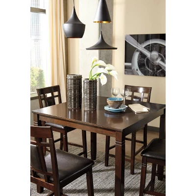 Set the scene for cool, comfortable and ultra-contemporary style with this counter table set. Counter-height design makes eating in feel more like dining out at a trendy pub. Richly upholstered in a practical faux leather with welcome back supports, the four bar stools are sure to satisfy. Signature Design by Ashley is a registered trademark of Ashley Furniture Industries, Inc.