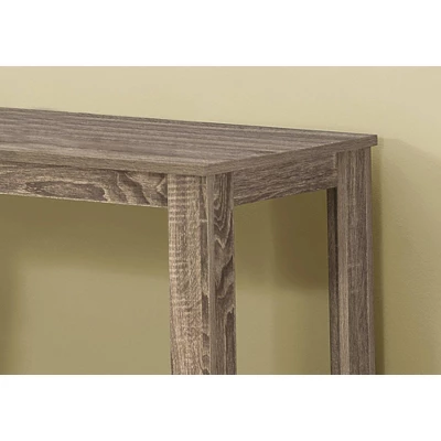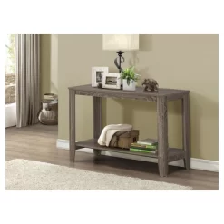 Complete your living space with this contemporary rectangular shape sofa console table. Finished in an alluring dark taupe reclaimed wood-look and featuring a lower shelf that offers additional space for storage or display, this sofa/console table is the perfect addition to any home. A beautiful combination when you add the 3 piece matching occasional table set.