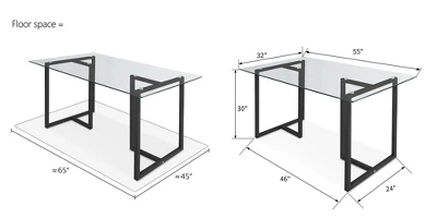 - Overall:55” L x 32” D x 30” HKnee Space: 30” H x 46” W x 32” DLegs:29.5” HDistance Between Floor Space: 30” H x 66” W x 45” D (Front)Distance Between Floor Space: 30” H x 46” W x 24” D (Back)