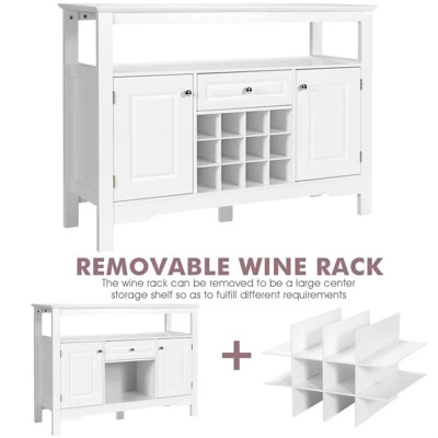 - Featuring a wine rack(holds 12 bottles), two one-door cabinet, one shelf, and one drawer