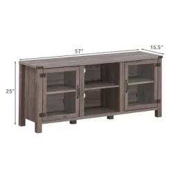 Our 57” TV stand is designed to upgrade the space of the entertainment center and add a touch of elegant and glamour to your living space!Crafted of high-quality engineered wood and 6 sturdy legs, this TV cabinet is stable and durable for long-term use. Spacious desktop will fit up to 65” TVs and some decorations. With adjustable design, 2-tier storage shelves and 2 large cabinet can not only offer plenty of space, but also meet the needs of items of different height. What’s more, the tempered glass doors is thick, visible and easy to keep clean. With clean line and exquisite appearance, it is suitable for your living room, bedroom, entryway, office and more.