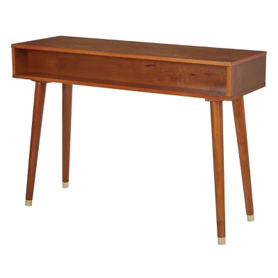 Get retro cool. You don’t have to spend hours combing through flea markets to find the perfect sofa table with this vintage inspired design. Beautiful solid wood with wood veneer construction makes up the body of this piece. The elegant brass finish drawer pulls and foot caps add the perfect accent to a living room. The table top surface provides ample space for displaying your favorite home dĂŠcor, while the side by side drawers offer additional storage space. Get the mid-century modern style you crave with the Cupertino console table.