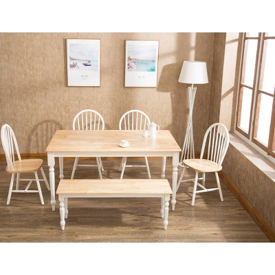 Classics, like the Boraam Farmhouse Table, never go out of style for a reason. Embodying the simplicity and cozy chic feel of farmhouse and cottage styles, this dining table brings warmth and elegance to your home. Its tropical hardwood construction features a two-toned natural and white finish. The natural wood top is polished to a high gloss to enhance the beauty of the rich wood grain. Clean-up is easy: just use a damp rag and some dish soap to wipe down the table in between meals. Gather loved ones around the table and enjoy your favorite meals together. This table can fit up to six guests – pair it with the matching Boraam Farmhouse Dining Chairs, which are sold separately.