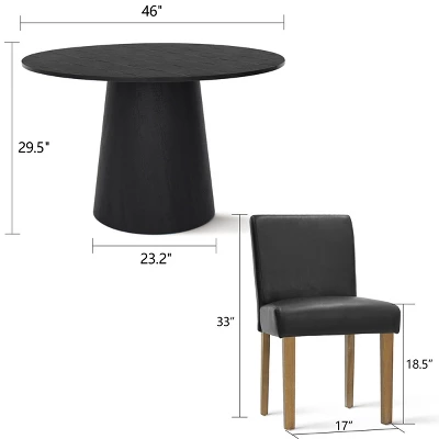 Experience the timeless elegance of this exquisite 5-piece round dining table set, expertly crafted to withstand the test of time. This set showcases a sturdy construction and classic design, making it an ideal addition to any dining space. Measuring at 46″ x 46”, this set comfortably accommodates a party of 4, providing ample room for each guest. The pedestal structure creates an open and airy ambiance, ensuring everyone seated around the table enjoys plenty of leg space for optimal comfort.The chairs are thoughtfully designed with utmost comfort in mind, featuring an engineered wood frame, foam seat padding, and high-quality faux leather upholstery. This combination guarantees a cozy seating experience and allows for multiple sitting positions.Supported by four rubberwood legs and a sleek natural wood grain finish, these chairs offer sturdy support for individuals weighing up to 250 lbs. The soft and textured faux leather upholstery adds a touch of sophistication and invites guests to relax and enjoy their meals. The chairs’ sleek design seamlessly complements any decor style, making them a versatile choice for your dining area.