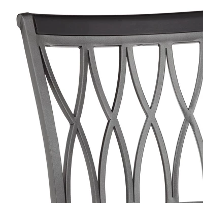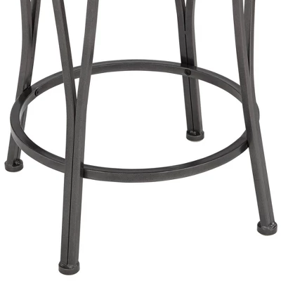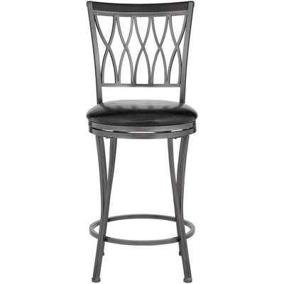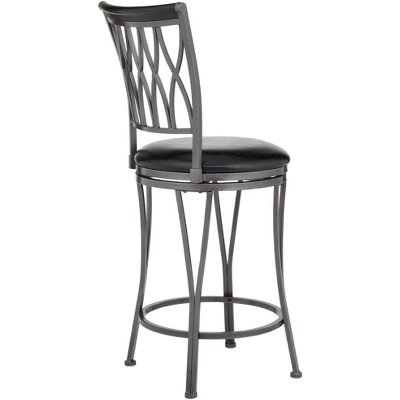 Simply modern beauty makes up the Dominick metal swivel counterstools set of two from the Elm Lane brand. Each stool features a black solid poplar wood backrest with a crisscrossing pattern. Round cushions provide a comfy place to sit while you swivel around or use the footrest at the bottom.