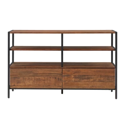 Add a burst of modern and rustic design with the Felicia Rustic Industrial TV Stand Console Table by iNSPIRE Q. The black powder coated metal frame creates longevity and sturdiness and beautifully contrasts the textured wood grain finish. This console table features 3 bottom drawers and a middle shelf that creates open storage for electronics or decorative items. This eye-catching design can be added to your modern, industrial or as rustic décor for a unique statement piece.