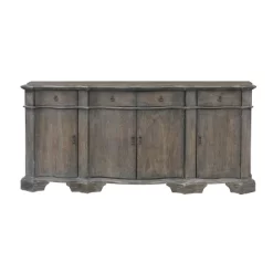 A distinctive scalloped shape flows form the top beveled edges to the shapely feet below on this majestic four door four drawer Credenza. Finished in our Sussex Russet Brown with a distressed patina adding an aged appearance to the natural wood tones, this Credenza has that antique quality that you so adore, plus all the storage room you need. Ideal for your dining room, foyer or den.
