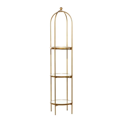 Place these metal shelving unit next to your upholstered sofa and decorate it with books and potted plants for a luxe upgrade. This item ships in 1 carton. Table features four legs and glass platforms. Suitable for indoor use only. This item ships fully assembled in one piece. Maximum weight limit is 30 lbs. This is a single gold colored display shelf. Metal shelving unit features 3 shelves. Glam style.