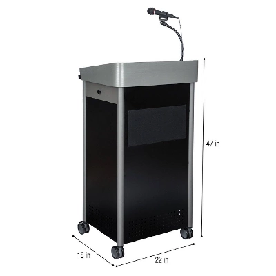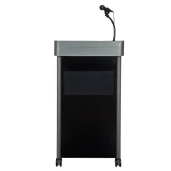 The graystone Lectern with sound from Oklahoma Sound is far more than just a basic lectern. This elegantly designed unit offers an all-in-one presentation experience. Large reading surface (22.75”W x 18.25”D), two side pull-out shelves (14.25”W x 12”D), and a sliding keyboard tray (17.5”W x 9.25”D) provides for a complete multi-media presentation experience. Designer curved gray plywood adds a sophisticated look. The cabinet includes three large shelves plus an oversized front drawer for ample storage. 2.5” hooded twin wheel matching casters makes for easy mobility. Elegance & functionality for all your presentation needs.