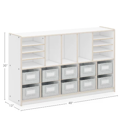 Guidecraft’s EdQ collection satisfies practical storage and organizational needs in classrooms, homeschool environments and kids’ play areas. The versatile, attractive furniture pieces in this complete collection provide opportunities for various easy configurations in any spaces where children learn and play. Keep kids’ toys, books, art supplies and learning materials organized and accessible with the EdQ Shelves and 10 Bin Storage Unit. This spacious, compartmentalized unit features a variety of storage shelves and cubby spaces. A finished back panel prevents objects from falling through and allows for multiple room arrangement options.