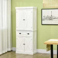 - UPGRADE YOUR STORAGE: This pantry cabinet with doors and shelves gives you plenty of room to for dishes, cookbooks, pots and pants, dry goods or plastic containers while the drawer allows you to put away napkins, towels and silverware. Keep organized behind the four doors, so your items stay safe and dust-free. If you have taller items, the three shelves can be customized to fit items like pitchers, pasta containers and blenders.