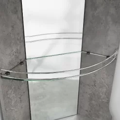 Your next get-together is going to be made even better with the Home Source Corner Bar Unit. It’s an all inclusive corner bar unit in a concrete finished hardwood frame. You won’t have to worry about where your stemware is going to go with the rack on the top and middle of this unit. Reflective mirrored panels are set behind these racks. The middle counter space is perfect for bottles or more wine glasses. Two silver chrome bars add sturdy support to the top of the unit. The base of this unit features one clear glass door for the middle shelves and two side shelves for any other items you need to store. Make this your one stop shop for setting up hor’dourves plates and serving drinks. Store bottles in the middle wine rack that can house four bottles.