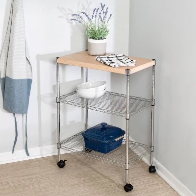 Honey-Can-Do CRT-04346 Mini 3-Tier Dining Cart, Chrome/Wood. Brilliant chrome finish and contemporary design makes this unit the perfect blend of good looks and functionality. Its sturdy, commercial quality frame has a grid-style thick wire shelves, hard work surface, adjustable shelves, and lockable wheels. Mobile, lightweight, and sturdy, this versatile cart can go wherever you need a little extra work space.
