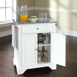 The Lafayette Full-Size Kitchen Island adds enduring style and storage to your kitchen. Featuring three cabinets, each with an adjustable shelf, this island can easily store pots, pans, and small appliances. Two large drawers keep small items like utensils and dishtowels close at hand, while the built-in spice rack and paper towel holder keep your counter space free of clutter. With a beautiful wood countertop and sculpted feet, the Lafayette Full-Size Kitchen Island is a welcome addition to your kitchen space.