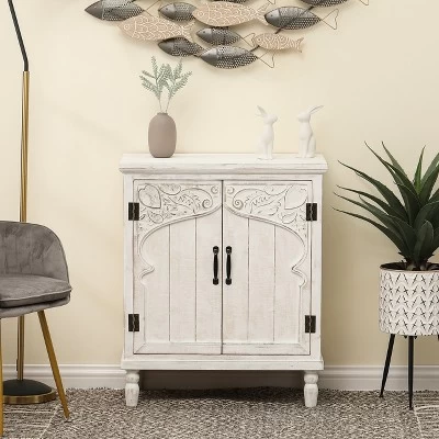 This trendy and practical cabinet is perfect for storing linens, extra dinnerware, and other household items. Adorned in rustic white finish that is further enhanced by the contrasting black metal handles and hinges shows off the beauty of the cabinet. Place this cabinet in your, living room, dining room, or any room in need of storage space for that charming piece that will add to any home. The two wooden doors have magnetic closures. The cabinet features a non-adjustable shelf in the middle to provide two open spaces inside the enclosed cabinet.Features: Care:Use a microfiber cloth or a disposable electrostatic duster to remove dust.Ā Use a paper towel or soft cloth to blot away liquid spills and condensation from drinks immediately. Wipe away the mess and immediately use a dry microfiber cloth to dry the wood and restore it back to its original finish.Specifications:Product Size: 33.25″ H x 27.75″ W x 15″ DProduct Weight: 29 lbs.Shelf Dimensions: 11.3″ H x 25.75″ W x 13″ DShelf Weight Capacity: 25 lbs.Weight Capacity: 130 lbs.Product Color: Distressed White, Black