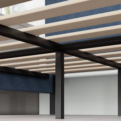 Strong, dark and handsome – sounds like your kinda bed? Then get ready to lay on it! This Zinus Omkaram upholstered platform bed will echo your style with its navy upholstery and button detail. Transform your bedroom into the wonder-filled, magical abode you always knew it could be! All parts are conveniently located in the zippered compartment in the back of the headboard for easy assembly.
