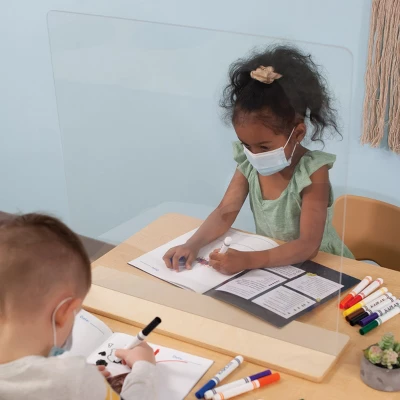 This 23″ wide by 23.25″ high partition is perfect for providing economical and effective sanitary protection. Ideal for use in early learning environments and childcare centers on wide tables. Perfect for encouraging social distancing. Acrylic panel sits in fitted groove within its 15mm base. Panel is removable for easy cleaning and partition is made in USA.