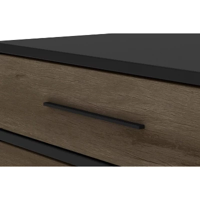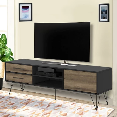 Provide a sophisticated abode to all your media gadgets by bringing in this contemporary style TV Media Console Stand which offers spacious storage with its 1 side door cabinet, 2 drawers, and 2 open compartments. Constructed from the combination of particleboard and metal, this entertainment center for your flat screen TVs is accented with a brown and black finish.