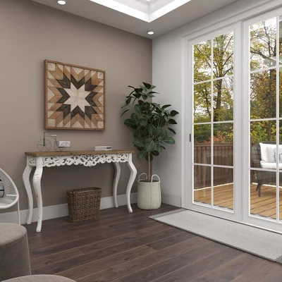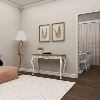 Bring a finishing touch to your home with an inviting appeal with this console table. A sturdy and long lasting construction for a years of enjoyment. Farmhouse wood carved console table will set a great first impression when displayed in entryways under a round wooden mirror. This item ships in 1 carton. Decorative wood carvings. Suitable for indoor use only. Some assembly required. Maximum weight limit is 75 lbs. This is a single white colored entryway table. Farmhouse style.