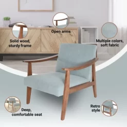 Zenvida’s Accent Chair will add retro style and comfortable seating to any room. With solid hardwood construction, the seat and back are upholstered in polyester blend fabric over foam fill. Decorate in contemporary, functional fashion with this arm chair.Add retro inspired style to your living space with this comfortable arm chair. The contemporary lines of the Zenvida Accent Chair will look great in the living room, bedroom, office or anywhere you seek a 50’s retro touch. Made from hard wood construction, the foam filled seat is upholstered in soft, durable polyester blend fabric. Inspired by iconic mid-century design, you’ll lounge with a bestseller or relax with friends in comfort. Comes in multiple colors to match any decor, with dark brown wood arms and legs.Overall height is 30″, width is 27.5″ and depth is 33″. Easy assembly. Weight capacity is 300 lbs.